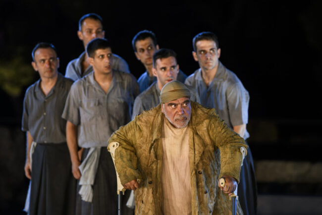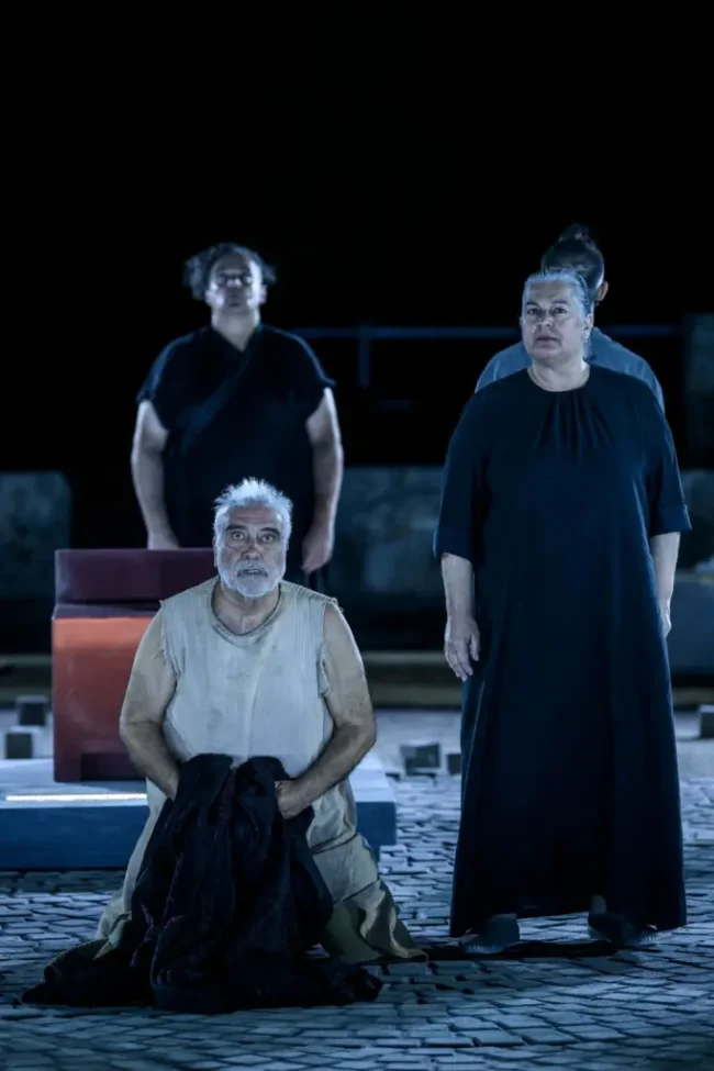 Η σκηνογραφία και οι φωτισμοί του Σάκη Μπιρμπίλη διατηρούν μια αυστηρή λιτότητα, που όμως δεν στερεί τίποτε από την ποιητικότητα της εικόνας. Η γη της σκηνής γίνεται τόπος εξορίας και προσευχής, πεδίο μάχης και εσωτερικής αναμέτρησης. Ο φωτισμός λειτουργεί οργανικά με τη ροή του δράματος· δεν υπερτονίζει αλλά σηματοδοτεί τις μεταπτώσεις: τις στιγμές απόγνωσης, τις εντάσεις, τα ψήγματα ελπίδας ή απειλής. Ο χώρος μένει ανοιχτός, τα σώματα εκτεθειμένα· το φως χτυπά όχι μόνο τους ηθοποιούς αλλά και τις λέξεις· η γυμνότητα του τοπίου καθρεφτίζει τη γυμνότητα της ανθρώπινης κατάστασης. Η μουσική του Λόλεκ λειτουργεί υποδόρια, χωρίς ποτέ να γίνεται συναισθηματικός οδηγός. Είναι περισσότερο μια υποψία, ένας κραδασμός, μια έλξη προς τα ενδότερα του δράματος.