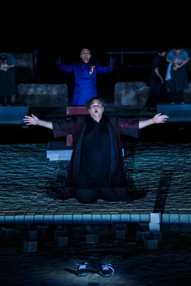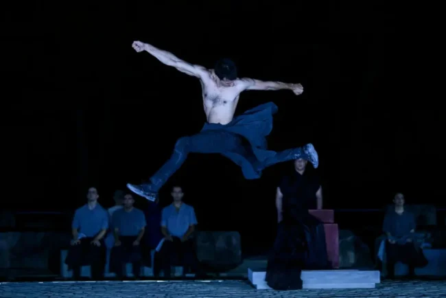 Στο κέντρο, ωστόσο, βρίσκονται τρεις ερμηνείες που έδωσαν στην παράσταση το βάρος της. Ο Αργύρης Ξάφης στην Ανδρομάχη δεν ενσαρκώνει απλώς έναν ρόλο· δημιουργεί επί σκηνής μια ύπαρξη σχεδόν μυστικιστική, τόσο σωματική όσο και φωνητική. Δεν μεταφέρει τον γυναικείο πόνο με μίμηση αλλά με ενσάρκωση· η φωνή του βγαίνει από τα σωθικά, με ραγίσματα και αιχμές, η κίνηση του σώματός του φέρει το ίχνος της αιχμαλωσίας, της εξάντλησης, της αξιοπρέπειας που δεν λυγίζει. Η ερμηνεία του είναι σιωπηλή όπου πρέπει, εκρηκτική όταν δεν υπάρχει άλλη επιλογή. Ο Ξάφης δεν παίζει την Ανδρομάχη· την κατοικεί – στη φωνή του αντηχούν οι απώλειες και τα αιτήματα δικαιοσύνης, στο σώμα του αποτυπώνονται οι μνήμες και τα σημάδια της εξορίας. Ο λόγος του δεν απαγγέλλεται· προφέρεται με πυκνότητα και ρωγμές, γεμάτος από τις σιωπές που προηγούνται του θρήνου.