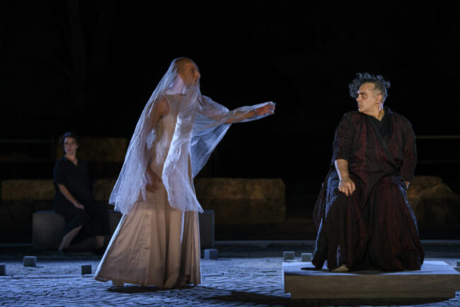 Ξεχωριστή σημασία έχει η σκηνοθετική απόφαση να ενταχθούν στη ροή της παράστασης αποσπάσματα από το πρωτότυπο αρχαίο κείμενο, δίπλα στο μεταφρασμένο στα νέα ελληνικά. Η επιλογή αυτή δεν λειτούργησε ως αναχρονιστική υπόμνηση αλλά ως αισθητική και νοηματική εμβάθυνση. Η αρχαία γλώσσα ακούστηκε όχι σαν κειμήλιο αλλά σαν πνοή· όχι σαν μουσείο, αλλά σαν φωνή. Η συνύπαρξη των δύο εκδοχών – η μετάφραση του Τσοκόπουλου και η αρχαιοπρεπής εκφορά ορισμένων εμβληματικών στίχων – επέτρεψε στο κοινό να αισθανθεί το βάθος, τη δομή και τη μετρική του πρωτοτύπου, χωρίς να χαθεί η πρόσβαση στο νόημα. Είναι μια σπάνια ισορροπία, που εδώ επιτυγχάνεται με ακρίβεια και συγκινητική διαύγεια.