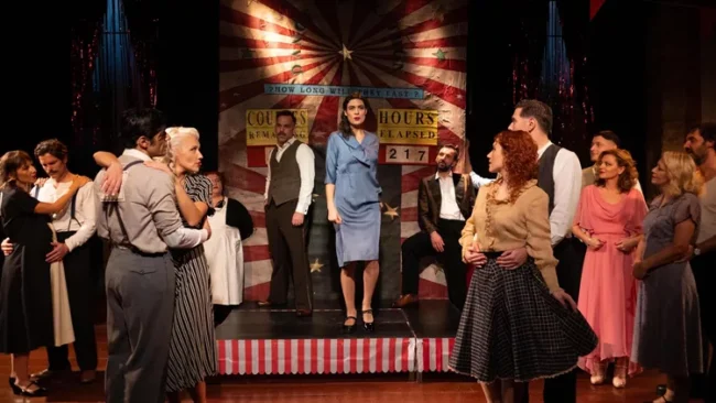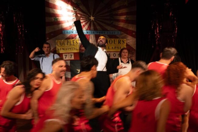 Η σκηνοθεσία του Δημήτρη Καρατζιά είναι υποδειγματική, καθώς καταφέρνει όχι μόνο να οργανώσει ένα μεγάλο καστ σε έναν μικρό χώρο, αλλά καθώς η παράσταση εξελίσσεται, αποτυπώνει απόλυτα την αρχική πρόθεση του έργου: ο μαραθώνιος χορού παύει οριστικά να μοιάζει με διαγωνισμό και μετατρέπεται σε μια σχεδόν ανθρωποφαγική τελετουργία.